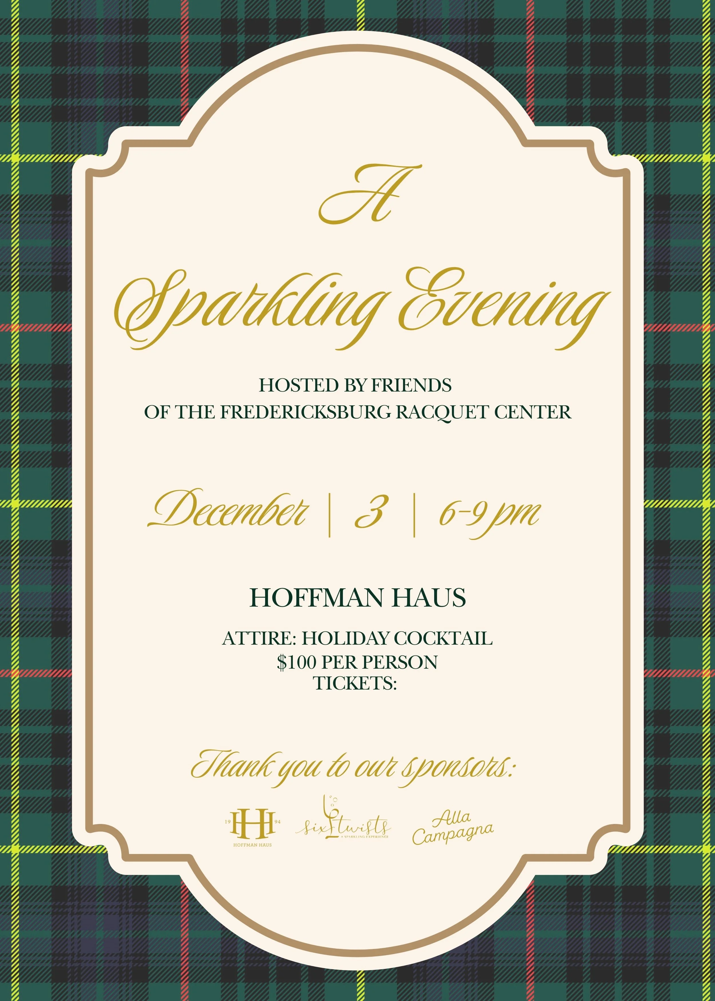 Kick off the Holiday season with the most anticipated bubbly event of the year! Hosted in partnership with Friends of the Fredericksburg Racquet Center, proceeds from this year's Sparkling Evening will fund the building of a community racquet center.