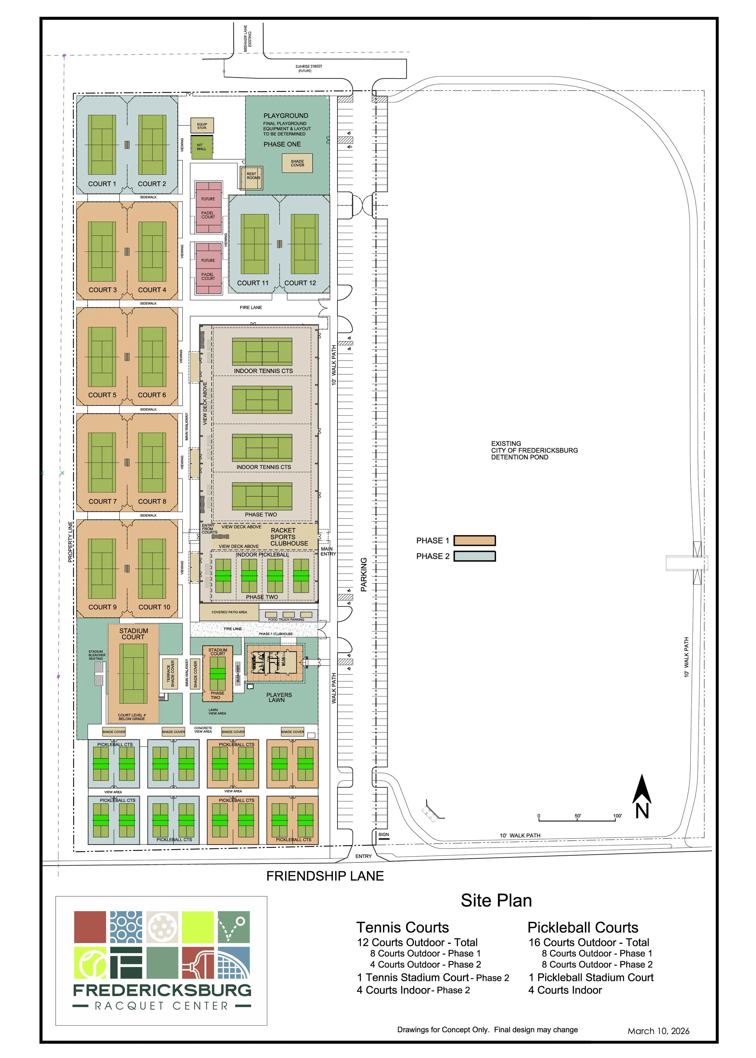 The Fredericksburg Racquet Center is a non-profit initiative that brings together the City of Fredericksburg, Fredericksburg Tennis Center Foundation, Austin-based Fueling Tennis Futures Foundation, tennis and pickleball professionals, community leaders, and racquet sports enthusiasts. The City is providing 20 acres on Friendship Lane for the development of the center. The facility will feature 17 dedicated pickleball courts, 13 tennis courts, 4 indoor pickleball courts, 4 indoor tennis courts, a clubhouse, and a public walking trail with a playground and public restroom.